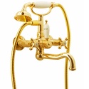Назначение: ванна+душ • Конструкция: двухрычажный • Монтаж: вертикальный • Материал: покрытие - золото • Подводка: жесткая • Монтажные отверстия: 2 отверстия • Форма излива: традиционная • Душевая лейка в комплекте: есть • Держатель для душевой лейки: на смесителе
