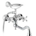 Назначение: универсальный • Конструкция: с раздельными клапанами • Монтаж: вертикальный • Материал: покрытие - золото • Монтажные отверстия: 2 отверстия • Форма излива: традиционная • Душевая лейка в комплекте: есть • Держатель для душевой лейки: на смесителе • Донный клапан в комплекте: есть